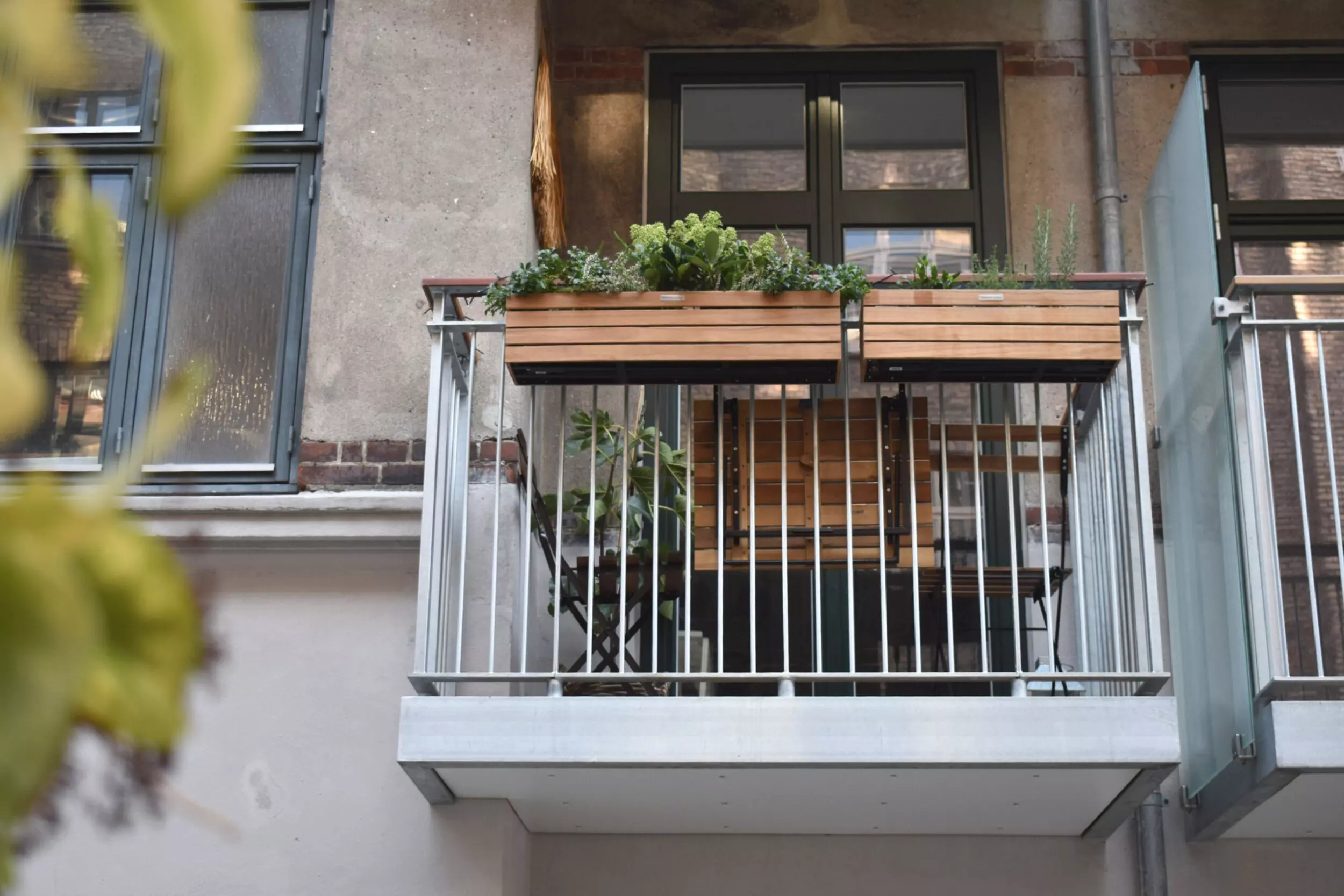 Altanerne er af varmgalvaniseret stål med håndliste og spiller godt sammen med facadens lige linjer. Gulvet er af hårdttræ og bidrager til et varmt og hyggeligt udtryk, når man træder ud på altanen.